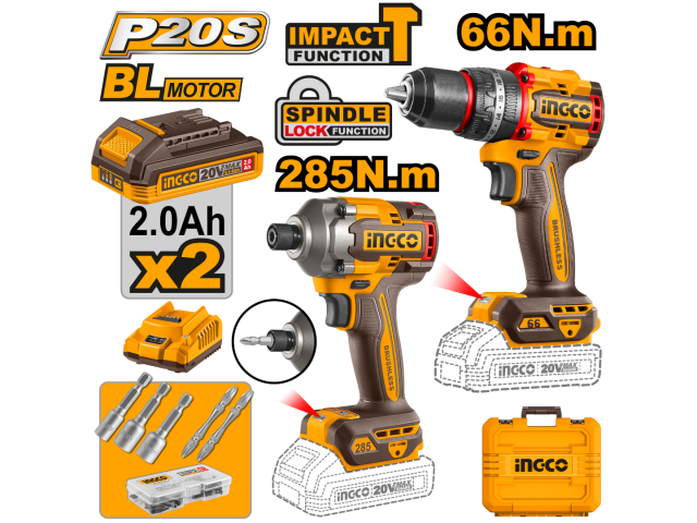 COMBO TALADRO ATORN C PERCUTOR 66NM + ATORNILLADOR DE IMPACTO 20V P20S BRUSHLESS C/2 BAT + CARGADOR + VALIJA + SET ACCESORIOS -Voltaje:20V -Con 1 taladro de impacto inalámbrico compacto sin escobillas (CIDLI206681) -Con 1 atornillador de impacto sin cable (CIRLI20281) -Taladro de percusión compacto sin escobillas (CIDLI206681): -Motor sin carbones -Velocidad sin carga: 0-500/0-2000rpm -Velocidad de impacto máx: 30000bpm -Par máximo: 66Nm -Portabrocas metálico -Capacidad del portabrocas: 13mm -Ajustes de par: 22+1+1 -Engranaje mecánico de 2 velocidades -Función de bloqueo del husillo -Luz de trabajo LED integrada -Atornillador de impacto sin cable(CIRLI20281): -Motor sin carbones -Mango hexagonal:6.35mm -No-load speed:0-1600/0-1900/0-2600rpm -Impact rate:0-2100/0-2500/0-2900bpm -Par máximo:285NM -Incluye: -1 Cargador de 20V (FCLI2001) -Voltios de carga: 220-240V~50/60Hz -2 baterías de 2.0Ah (FBLI20011) -47 piezas de accesorios -2 puntas de destornillador -3 piezas de tuercas