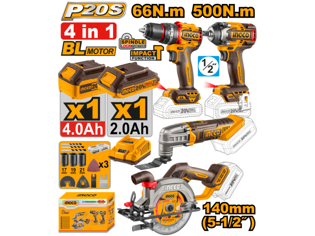 KIT A BATERIA P20S 20V 4 PIEZAS BRUSHLESS MOTOR C/2BAT, CARGADOR Y ACCESORIOS -Con 1 taladro de impacto inalámbrico compacto sin escobillas (CIDLI206681) -Con 1 llave de impacto inalámbrica (CIWLI20501) -Con 1 sierra circular inalámbrica (CSLI1402) -Con 1 multiherramienta inalámbrica (CMLI2022) -Taladro de impacto inalámbrico compacto sin escobillas (CIDLI206681): -Motor sin carbones -Velocidad en vacío: 0-500/0-2000rpm -Velocidad máxima de impacto: 30000bpm -Par máximo: 66Nm -Portabrocas metálico -Capacidad del portabrocas: 13mm -Ajustes de par: 22+1+1 -Engranaje mecánico de 2 velocidades -Función de bloqueo del husillo -Luz de trabajo LED integrada -Llave de impacto sin cable(CIWLI20501): -Motor sin carbones -Accionamiento cuadrado: 1/2" -Velocidad en vacío: 0-1200/0-1800/0-2200rpm -Velocidad de impacto: 0-2400/0-2800/0-3300bpm -Par de apriete: 500Nm -Par de apriete de tuercas: 650Nm -Luz de trabajo LED integrada -Sierra circular sin cable(CSLI1402): -Motor sin carbones -Velocidad sin carga:6300rpm -Diámetro de la hoja:140mm(5-1/2"") -Tamaño del eje:20mm -Profundidad de corte ajustable -Corte en bisel ajustable -Capacidad de corte: -45°grado:33mm -90°grado:50mm -Multiherramienta sin cable(CMLI2022): -Velocidad sin carga: 5000-20000rpm -Ángulo de oscilación: 3.2° -6 velocidades ajustables -Incluye: -47 piezas de accesorios -3 piezas de brocas para albañilería -1 pieza de clip para cinturón -3 piezas de vasos (21,22,24mm) -1 pieza de hoja de 140mm -1 pieza de rascador flexible -1 pieza de hoja de sierra de corte -1 pieza de hoja de sierra de segmentos -1 pieza de llave hexagonal -1 pieza de base de lijado -3 piezas de papel de lija -1 pieza de batería de 4.0Ah (FBLI2022). 0Ah batería pack(FBLI20021) -1 Pcs 2.0Ah batería pack(FBLI20011) -1 Pcs cargador(FCLI2001) -Voltios de carga: 220-240V~50/60Hz