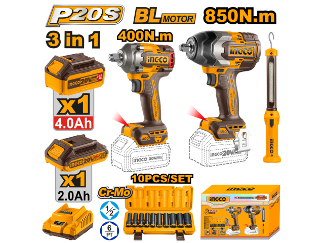 KIT COMBO A BATERIA P20S 20V 2 LLAVES DE IMPACTO 400NM y 850NM + LINTERNA C/ 2 BATERIAS, CARGADOR Y ACCESORIOS -Voltaje:20V -Con 1 llave de impacto inalámbrica (CIWLI20851) -Con 1 llave de impacto inalámbrica (CIWLI20401) -Con 1 lámpara de trabajo (HWLI35261) -Llave de impacto sin cable (CIWLI20851): -Motor sin carbones -Accionamiento cuadrado:1/2"» -Velocidad sin carga: 0-1600/0-2100/0-2400rpm -Velocidad de impacto: 0-1500/0-1800/0-2200bpm -Par de apriete: 850Nm -Par de apriete: 1000Nm -Luz de trabajo LED integrada -Llave de impacto sin cable (CIWLI20401): -Motor sin carbones -Accionamiento cuadrado: 1/2"» -Velocidad sin carga: 0-1600/0-1900/0-2300rpm -Velocidad de impacto: 0-2100/0-2500/0-2900bpm -Par de apriete: 400Nm -Par de apriete de tuercas 550Nm -Luz de trabajo LED integrada -Luz de trabajo (HWLI35261): -Con batería recargable de polímero de litio -Lúmenes: -Max:300±10% -Bajo:75±10% -Disipación de energía LED:3.5W -Incluye: -10 Piezas 1/2«»DR. juego de llaves de impacto(Material:Cr-MO,Tamaño:10.12.13.14.15.17.19.21.22.24mm) -1 batería de 4.0Ah (FBLI20021) -1 batería de 2,0 Ah (FBLI20011) -1 pieza de carga (FCLI2001) -Voltios de carga: 220-240V~50/60Hz