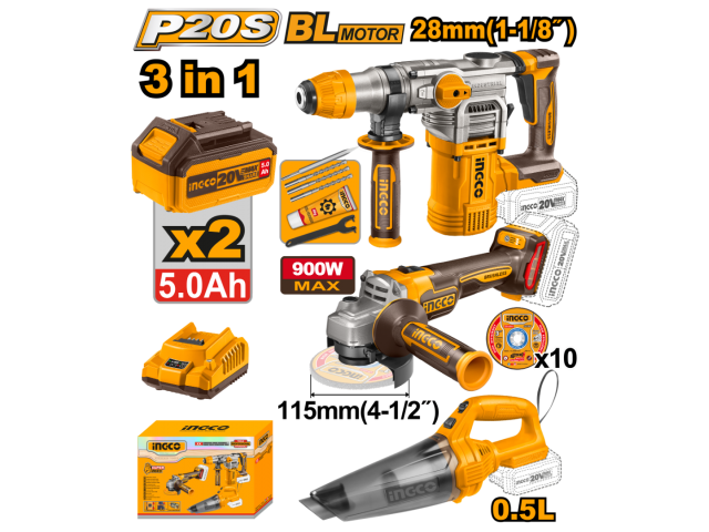 KIT COMBO A BATERIA P20S 20V C/ROTOMARTILLO + AMOLADORA + ASPIRADORA C/ 2 BATERIAS, CARGADOR Y ACCESORIOS INGCO COSLI240