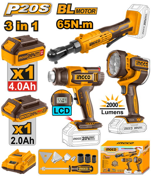 KIT COMBO A BATERIA P20S 20V LLAVE CRIQUE + PISTOLA DE CALOR + LINTERNA C/2 BATERIAS, CARGADOR Y ACCESORIOS INGCO COSLI2