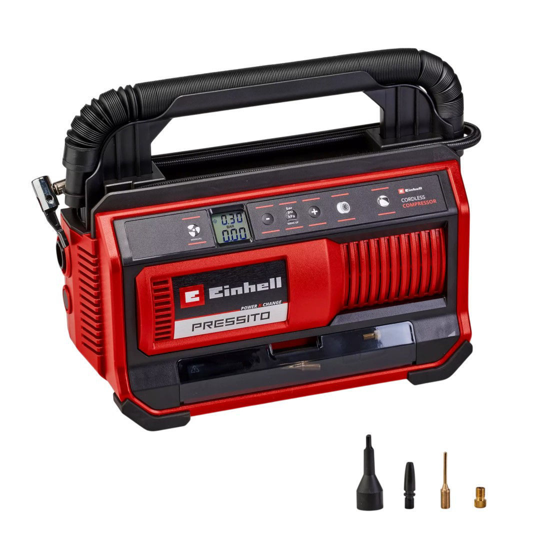 ¿El aire se acaba? No con el compresor con batería PRESSITO 18/25 de Einhell: como parte de la potente familia Power X-Change se opera el compresor con una batería Power X-Change de 18 V. Su bomba de alta presión alcanza hasta 11 bar y es adecuada idealmente para inflar balones, neumáticos de bicicleta y coche. La bomba de baja presión aporta aire en colchones de aire y animales de juego para la piscina. El aire puede dejarse salir en la conexión con la opción de succión de baja presión. En el indicador LCD de dos filas pueden leerse la presión real y de consigna en bares, psi o kPa. Si se alcanza la presión deseada, la bomba se desconecta automáticamente. Un interruptor de botón para inflar en el rango de baja presión sin preajuste de presión simplifica adicionalmente la manipulación. El set adaptador de 3 piezas contenido en el alcance del envío contiene una aguja de balón, un adaptador de neumático y un adaptador cónico. El adaptador encuentra espacio en el compartimento de almacenamiento práctico e integrado en la carcasa del compresor. Así no se pierden las piezas individuales. El tubo de alta y el de baja presión pueden alojarse ahorrando espacio en compartimentos integrados. Una práctica asa de transporte y su bajo peso hacen al compresor el acompañante manejable de camino y en casa. Envío se realiza sin batería ni cargador. Estos son adquiribles por separado, por ejemplo, como un práctico set para principiantes de Einhell.